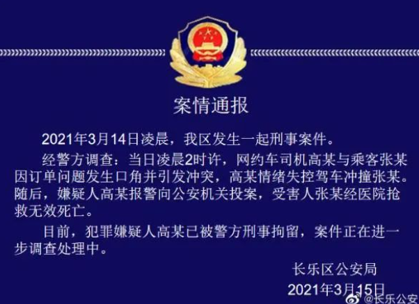 经警方调查:当日凌晨2时许,网约车司机高某与乘客张某因订单问题发生口角并引发冲突,高某情绪失控驾车冲撞张某。